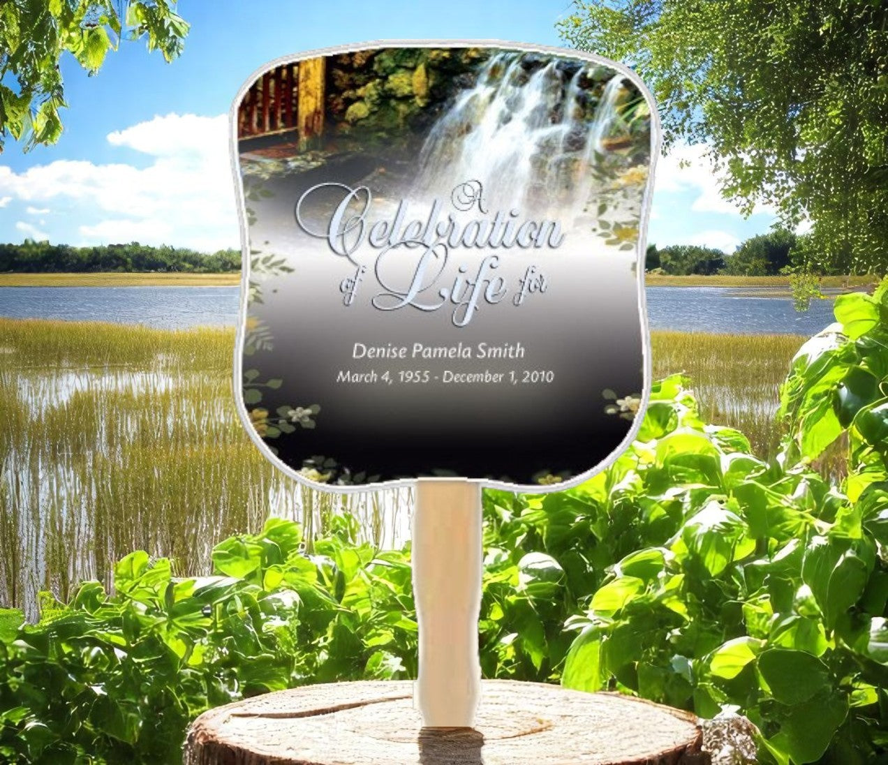 The Serene Memorial Fan With Wooden Handle features a peaceful design with a gentle waterfall cascading into a nearby pond, surrounded by lush, blossoming vines. The Serene Memorial Fan With Wooden Handle offers a calming and natural tribute, perfect for honoring a loved one who appreciated beauty and tranquility.