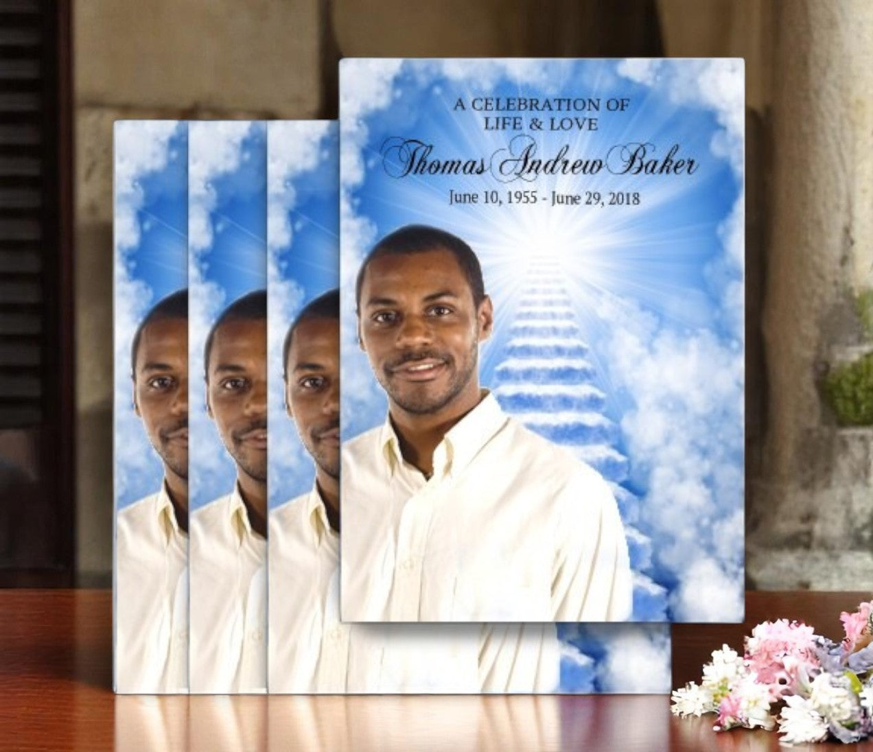 The Stairway Funeral Memorial Card Design & Print is designed as a flat, no-fold card, making it easy to distribute at funeral services or memorial gatherings. With ample space for a photo, brief tribute, or personal message, this card serves as a meaningful keepsake, helping friends and family celebrate a cherished life with grace and spiritual comfort.