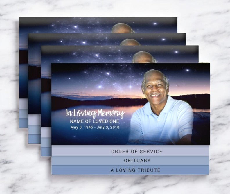 The Starlight 8-Sided Graduated Bottom Program Design & Print features a layered, graduated fold layout with eight panels, providing ample space for sharing a detailed obituary, service order, poetry, and photo tributes. Its soft glow and soothing imagery create a heartfelt and elegant keepsake to commemorate a loved one’s memory.