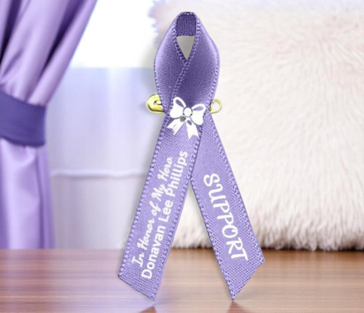 The Personalized Stomach Cancer Awareness Ribbon (Periwinkle) features a soft purple periwinkle hue that symbolizes awareness and support for those affected by stomach cancer. Accented with a delicate white bow in the center, this ribbon serves as a meaningful tribute to loved ones who have faced or are currently battling this disease. The Personalized Stomach Cancer Awareness Ribbon (Periwinkle) reflects both strength and compassion in its elegant design.