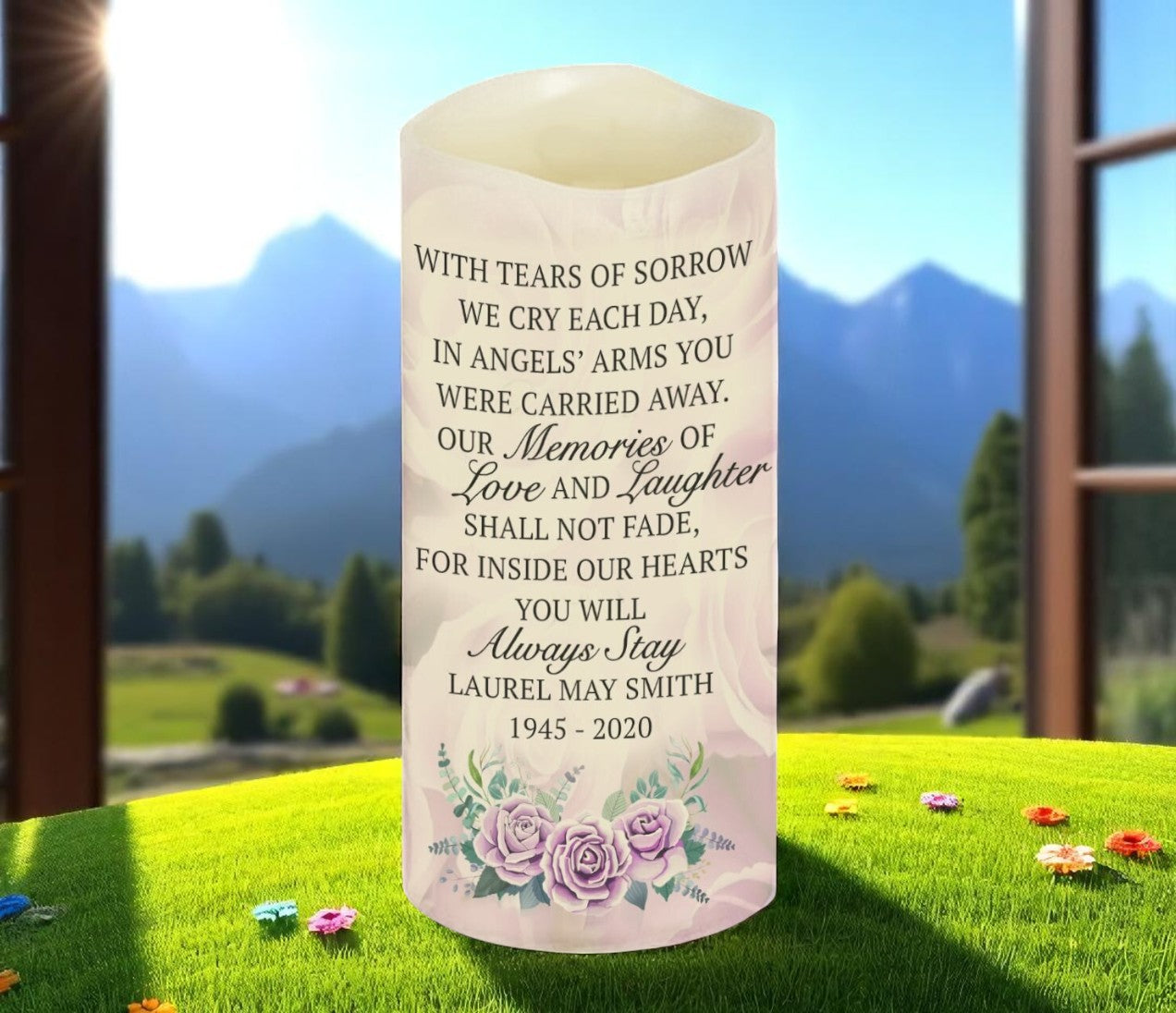 The Tears of Sorrow Personalized LED Memorial Candle features a full wrap-around design with a soft lavender floral rose pattern, accented by a lovely trio of roses beneath the heartfelt poetry. The inscription reads: "With tears of sorrow, we cry each day, in angels' arms you were carried away. Our memories of love and laughter, shall not fade, for inside our hearts, you will always stay."