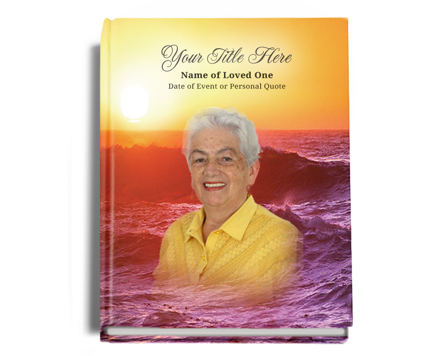 The Twilight Funeral Guest Book features the gentle waves of the ocean during the twilight of the day, setting the mood and design for this beautiful hardcover-bound guest book. This serene and peaceful design provides a comforting space for guests to leave their heartfelt messages, offering solace and remembrance during a memorial service. The twilight ocean scene in the Twilight Funeral Guest Book symbolizes calm, reflection, and the beauty of life’s transitions.