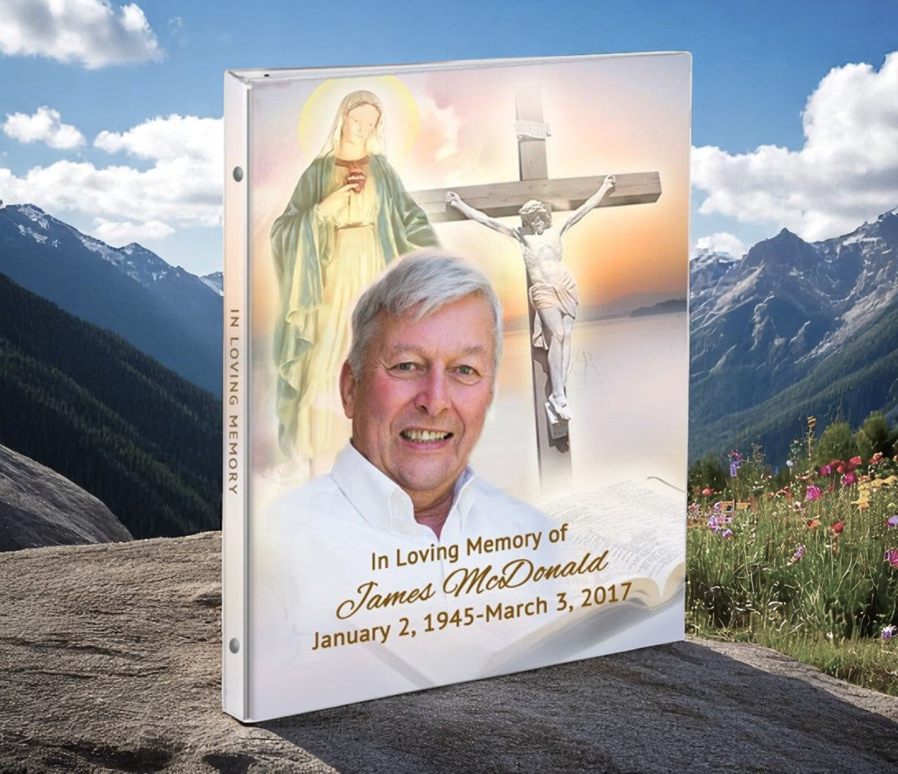 The Vision 3-Ring Binder Funeral Guest Book features a beautiful Catholic faith-based design, with a soft sunset backdrop, crucifix, Blessed Mary, and an open Bible layout. This elegant guest book provides a serene space for guests to leave their heartfelt messages, offering comfort and remembrance during a memorial service. The spiritual imagery in the Vision 3-Ring Binder Funeral Guest Book symbolizes faith, hope, and eternal love.