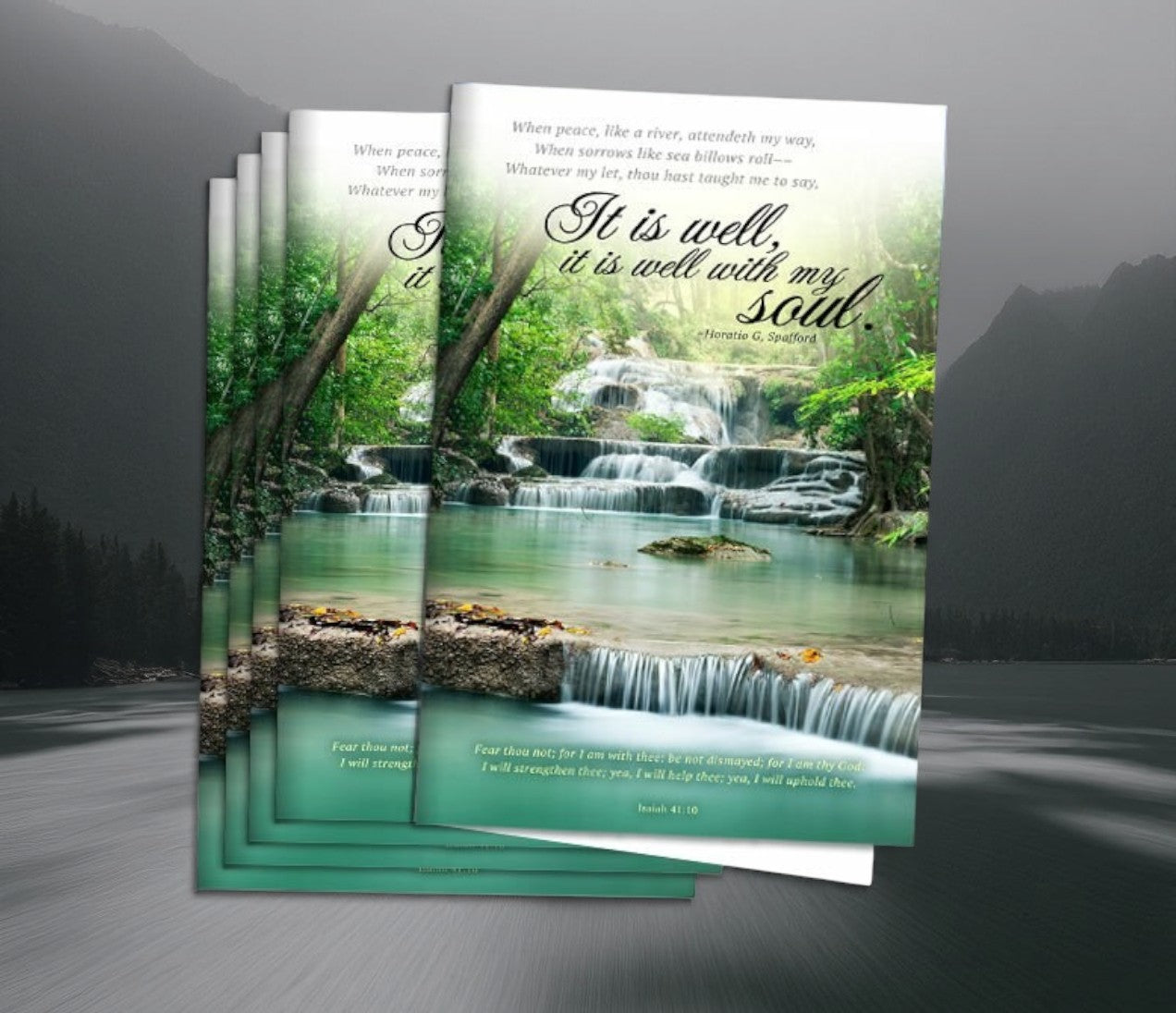Well With Soul Funeral Program Paper (Pack of 25) presents a peaceful and uplifting design, ideal for creating a heartfelt tribute. Well With Soul Funeral Program Paper (Pack of 25) features a lush landscape with a gently flowing brook winding through its center, symbolizing serenity and the enduring journey of the soul. The imagery evokes a sense of calm and reflection, making it a fitting choice for memorial services. Professionally preprinted on letter-size paper, Well With Soul Funeral Program Paper (Pack of 25) is ready for customization with your own text and photos.